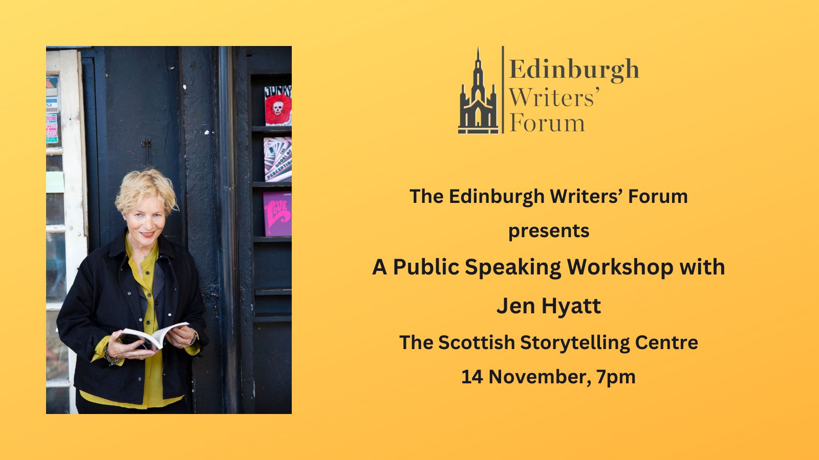 For the November edition of the Edinburgh Writers' Forum, Jen will discuss techniques and skills for speaking and presenting that writers can use and develop followed by a workshop to put these into practice. Willing volunteers should bring work to read from in order to develop their skills with constructive feedback from Jen.